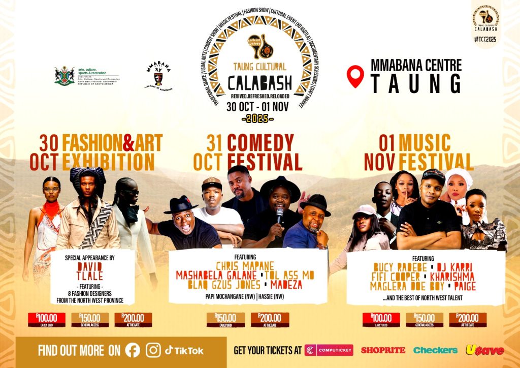 The Taung Cultural Calabash Festival is back and bigger than ever — returning under the vibrant theme “Revived, Refreshed, Reloaded”, a fitting reflection of its renewed energy and celebration of creativity, culture, and artistic excellence in the North West Province. The festival will take place from 30 October to 1 November 2025 at the Mmabana Taung Centre, promising an unforgettable cultural experience for patrons across the province.